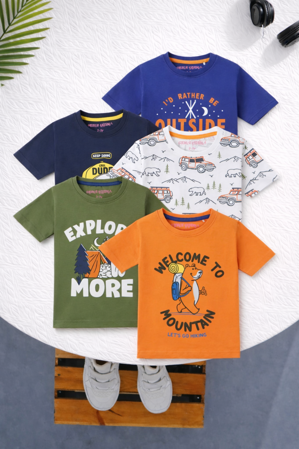 Googo Gaaga 5pcs T-shirt has a round neck and half sleeves. Soft fabric ensures optimum air circulation, Smooth and soft texture prevents causing any irritation to the skin. Tailored in the finest quality fabric for utmost comfort. Bottoms with an elasticated waist for a comfortable fit. The colorfast design avoids fading or bleeding of dyes. Googo Gaaga is one of the top kid's wear choices & the best brand you can trust with hundreds of styles. Fabric 90% Cotton + 10% Polyester. Boys clothing set, Item Included: 1 5pcs T-shirt, Type: Regular Fit, Occasion: Casual Wear, Gentle machine wash.