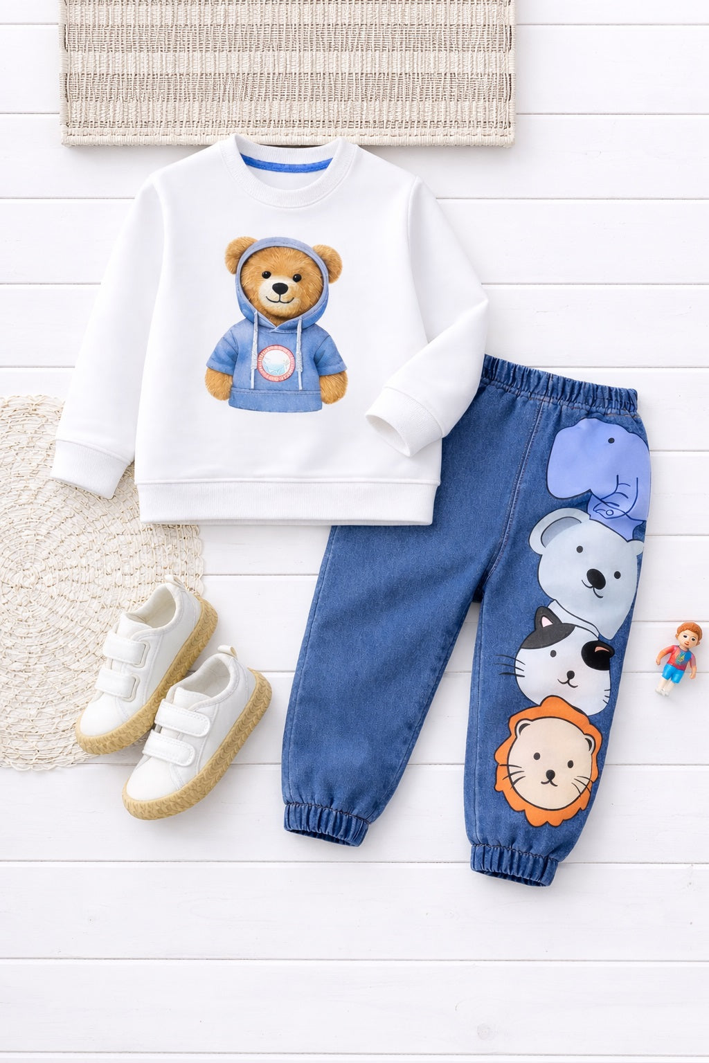 Boy's Cotton Knit Light Winter Full Sleeves Teddy Print Sweatshirt & Animal Printed Pant Set - White