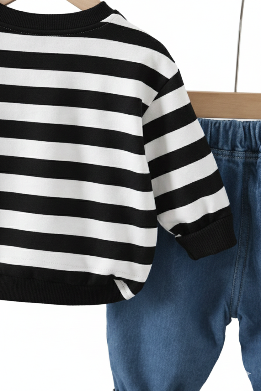 Boy's Cotton Loop Knit Winter Full Sleeves Teddy Embroidered Sweatshirt & Denim Pant Set - Black