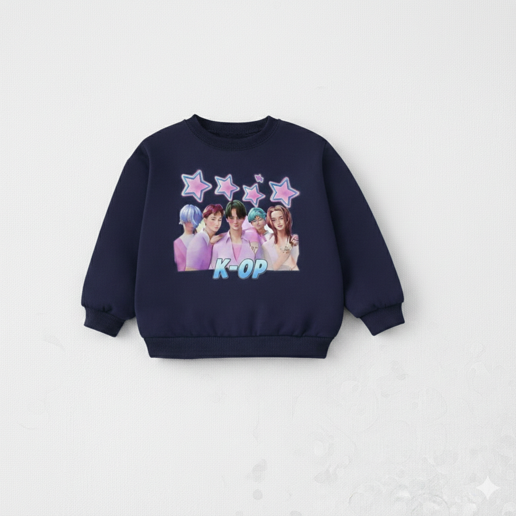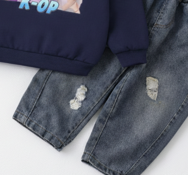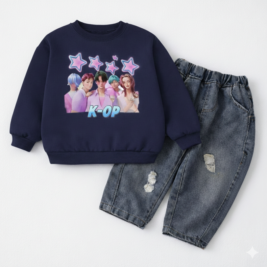 Girl's Cotton K-Pop Printed Sweatshirt With Jeans Set - Navy