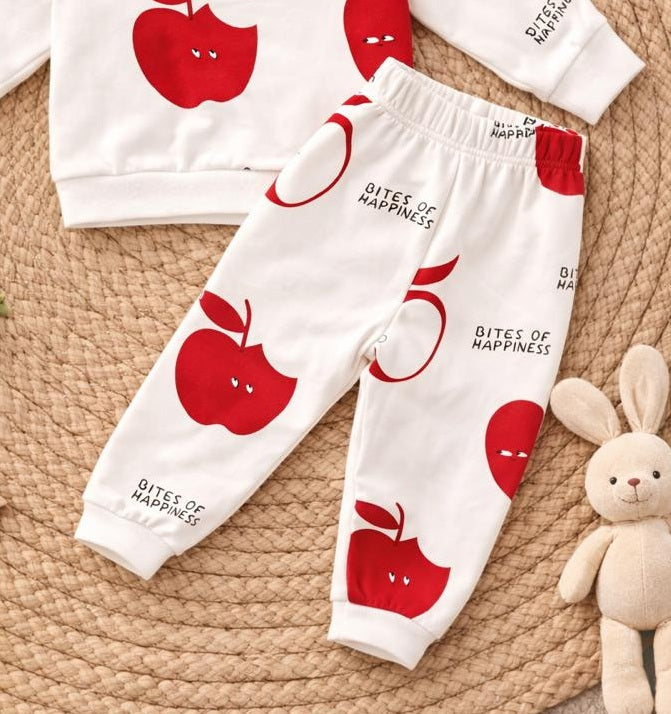 Boy's Cotton Apple & Santa Printed Sweatshirt With Joggers Set - Cream & Red