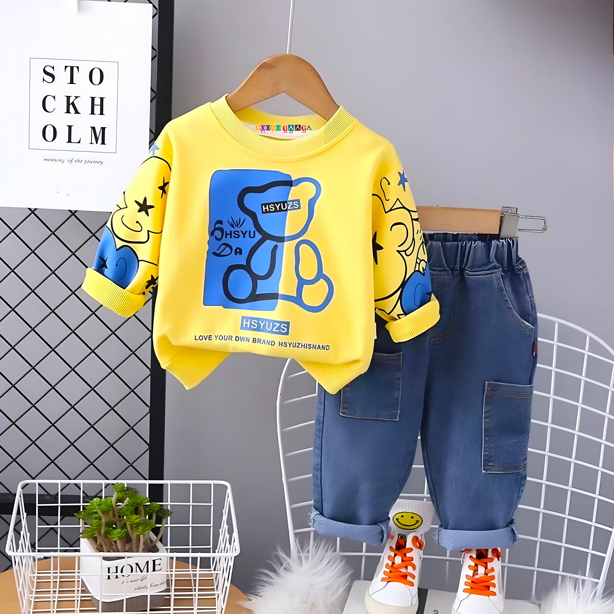 Boy's Yellow Teddy Print Sweatshirt & Pants Set