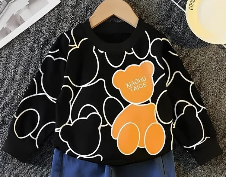 Boy's Cotton Knit Light Winter Teddy Printed Sweatshirt With Joggers Pant Set - Black