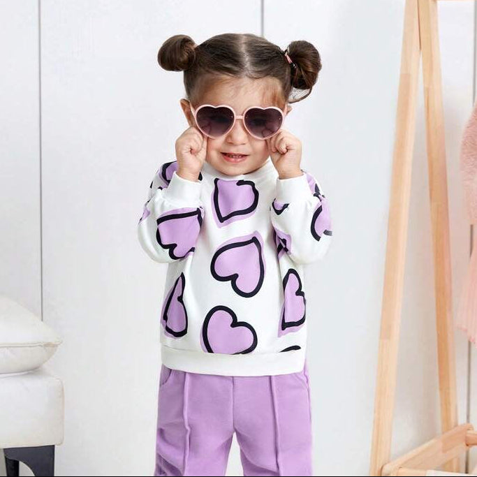 Girl's Cotton Knit Light Winter All Over Heart Printed Sweatshirt With Joggers Pant Set - Lilac